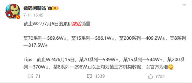 随后是华为mate 70系列,激活量大概有589.6万+,小米15系列排在第三、vivo x200系列排第四、oppo Find x8系列排第五,而这次荣耀magic 7系列直接跌出前五。