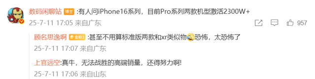 权威机构每个月都会统计的旗舰手机激活量,据博主数码闲聊站爆料,截止7月6日/今年第27周,iPhone 16 pro系列两款手机的激活量加起来达到2300万+,远超国产高端旗舰手机。